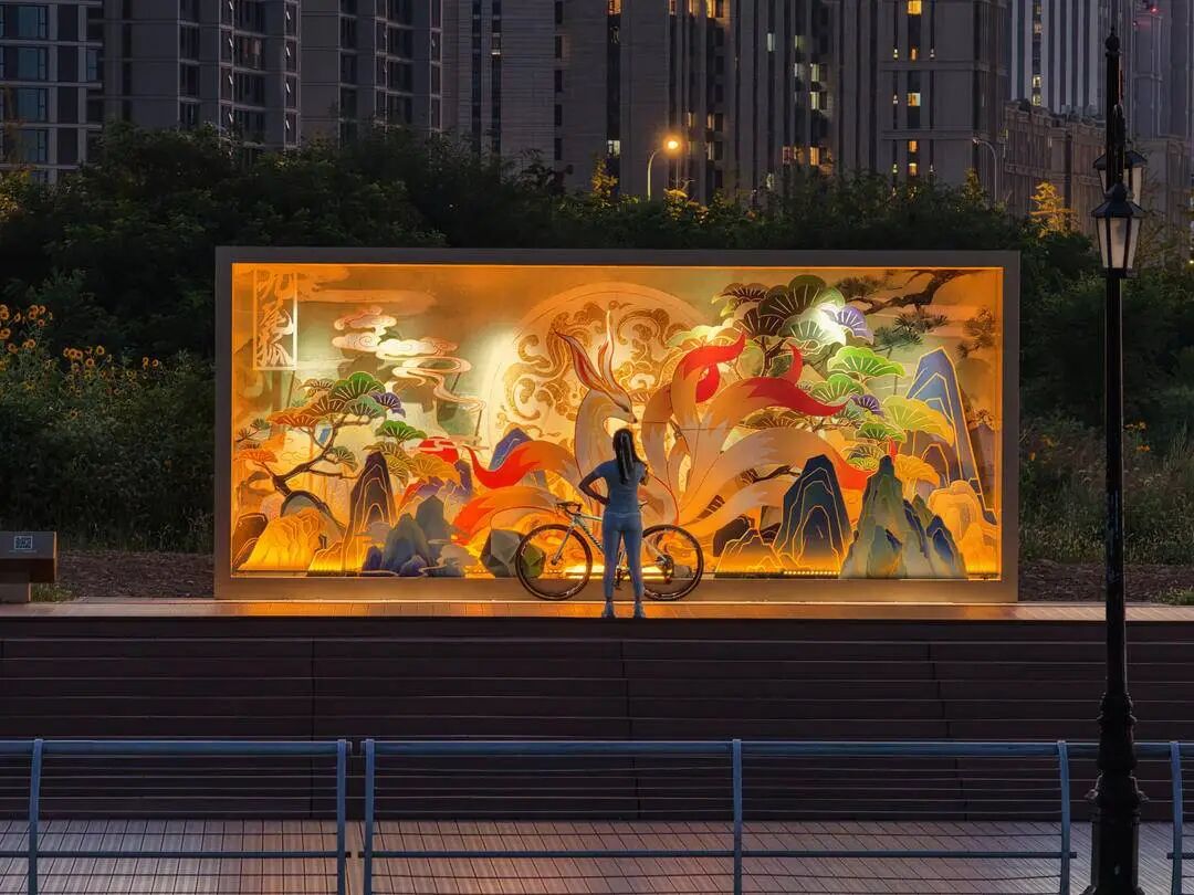 踏入山海經(jīng)文化休閑棧道,一場(chǎng)穿越千年神話的光影奇旅瞬間開(kāi)啟。約1200米的棧道,宛如一條時(shí)光隧道,將《山海經(jīng)》的文化元素巧妙融入。7處大型立體繪本藝術(shù)裝置錯(cuò)落分布,九尾狐、金烏等靈獸栩栩如生,共工觸山、女?huà)z補(bǔ)天等傳說(shuō)躍然眼前。白晝時(shí)分,陽(yáng)光灑在裝置上,散發(fā)著神秘氣息;夜幕降臨,光影交織,古老神話仿佛觸手可及。來(lái)自鄭州的游客何琦興奮地說(shuō):“白天看這些裝置,就覺(jué)得特別精美,晚上燈光一亮,感覺(jué)真的走進(jìn)了神話世界,太神奇了!”