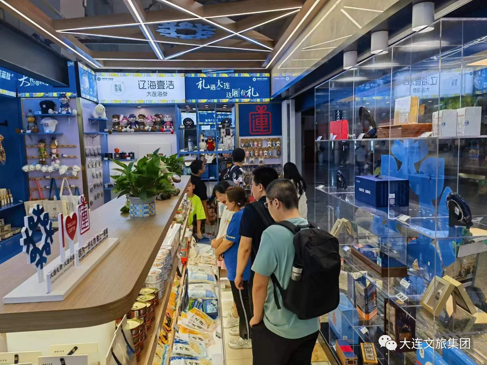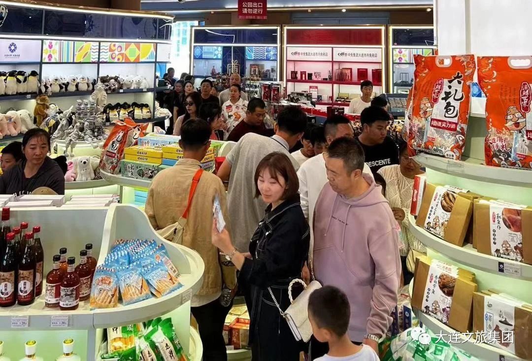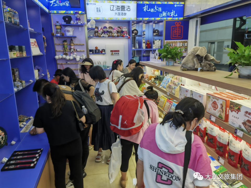 門店內(nèi)各種獨(dú)具特色的大連文創(chuàng)商品及地域特色食品深受游客們的喜愛,引得游客們的駐足、欣賞和購買。