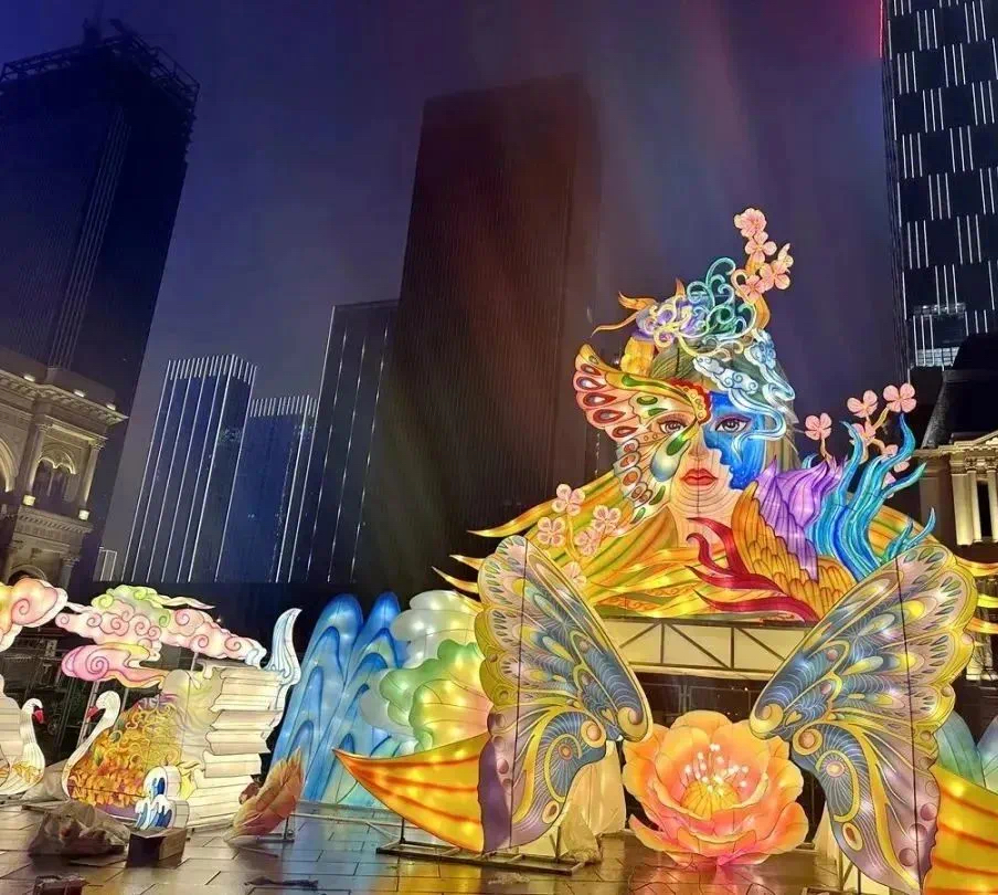 這里有象征著中國傳統(tǒng)文化的國潮國粹燈組、象征著新春祝福的龍鳳呈祥燈組,象征著童趣的木馬樂園燈組等38個(gè)造型燈組打造的光影藝術(shù)圈。
