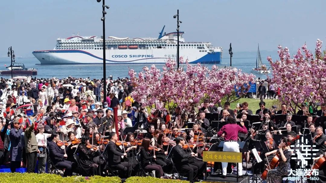 現(xiàn)場,大連愛樂交響樂團帶來的一曲《花好月圓》拉開了春之潮草地音樂會的序幕,伴隨著《我和我的祖國》熟悉的旋律響起,現(xiàn)場的游客不約而同放聲高唱,將演出推向了高潮,贏得了陣陣掌聲。