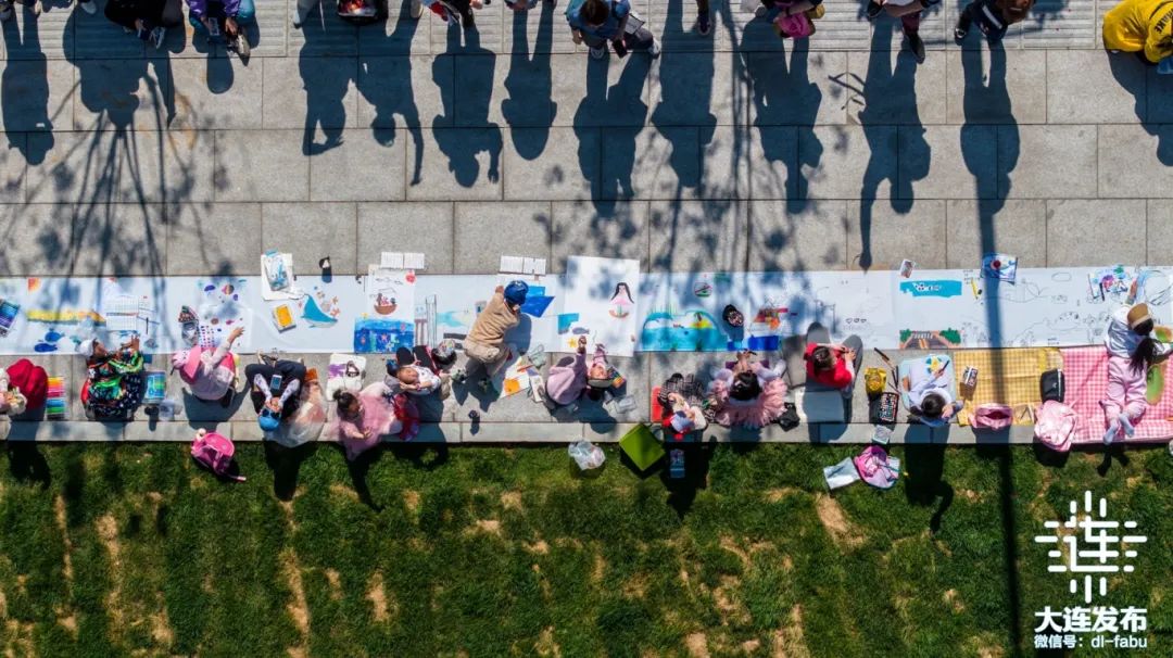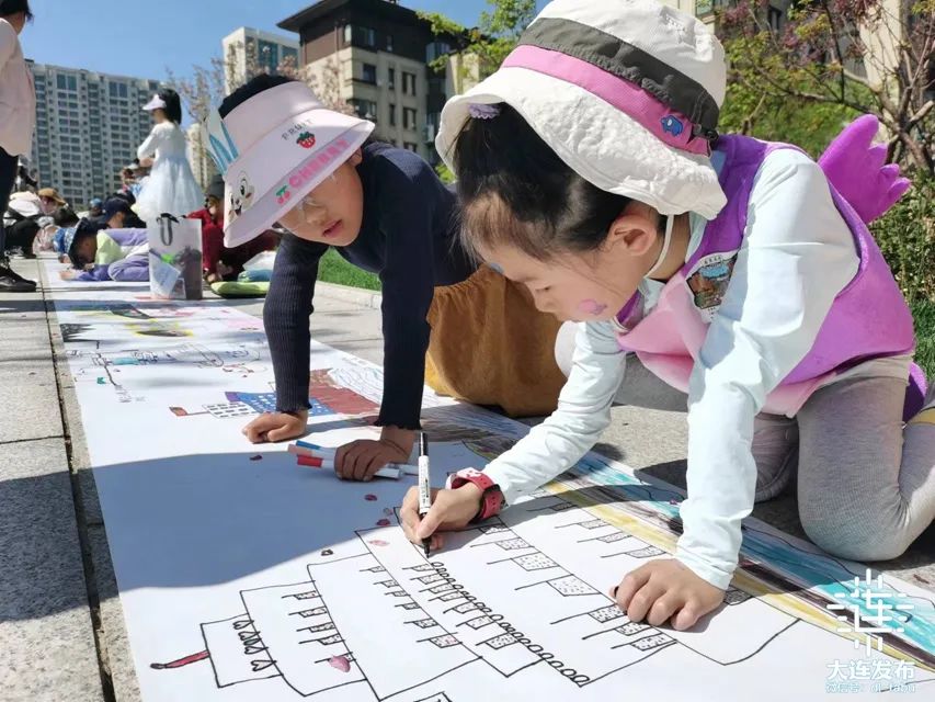 5月2日上午,大連港東五街上,另外一道靚麗的風(fēng)景線也讓眾多前來打卡大海大船的市民游客駐足,百米長卷在向海公路上鋪展,150名兒童共同描繪童心童趣。